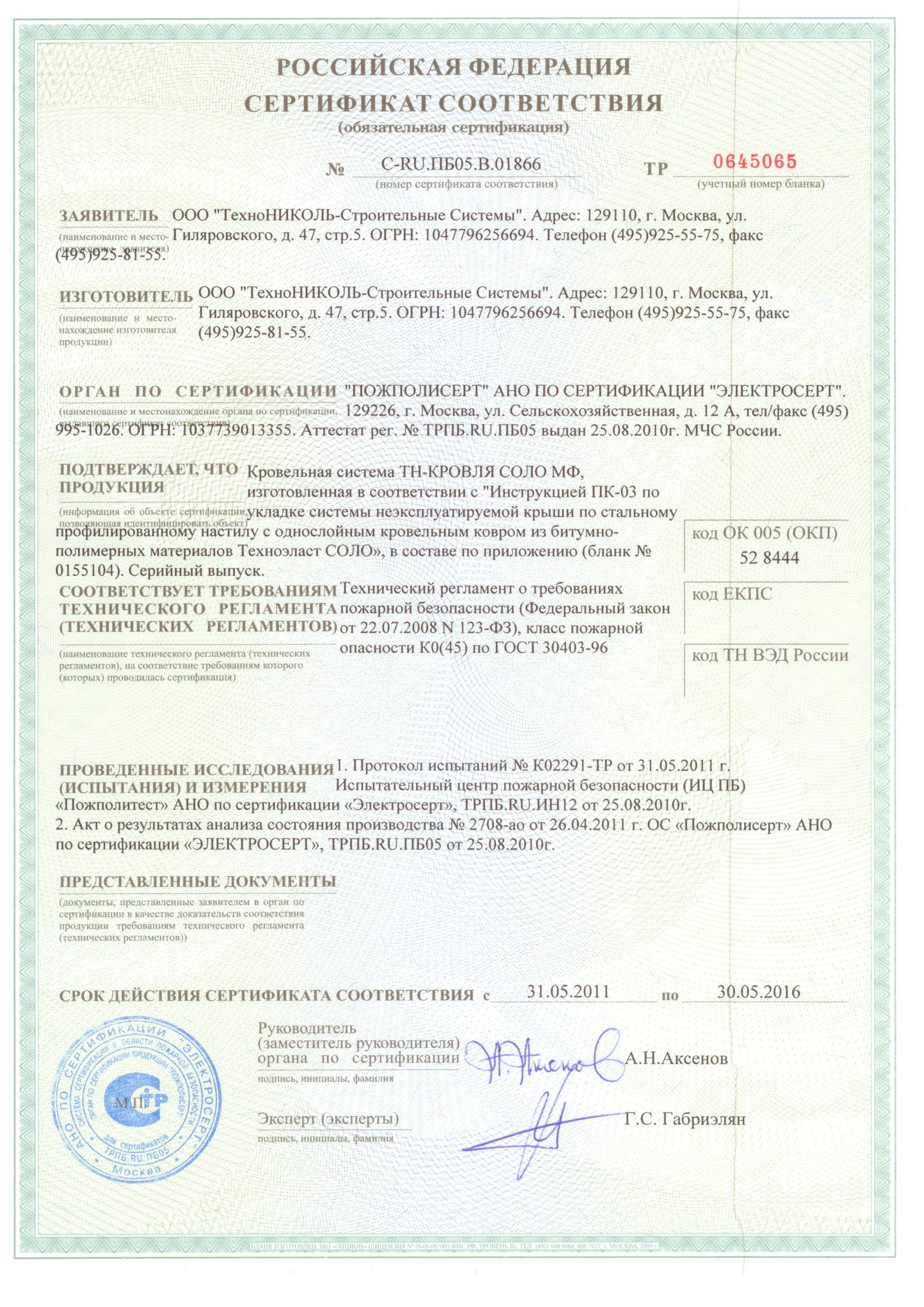 ТН-КРОВЛЯ СОЛО МФ: получен сертификат соответствия пожарной безопасности - ТехноНИКОЛЬ